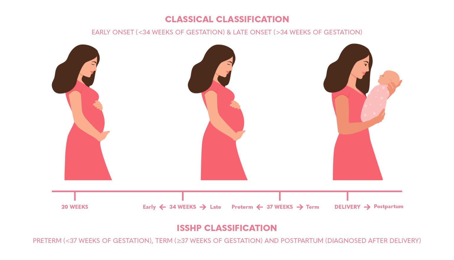 Classical classification of pre-eclampsia included early-onset (<34 weeks gestation) and late-onset (>34 weeks gestation). However, this classification lacks clinical utility as it does not accurately illustrate maternal or foetal prognosis. Therefore, the International Society for the study of Hypertension in Pregnancy (ISSHP) and contemporary studies prefer to classify pre-eclampsia as preterm (delivery <37 weeks of gestation), term (delivery ≥37 weeks of gestation) and postpartum pre-eclampsia (after delivery).