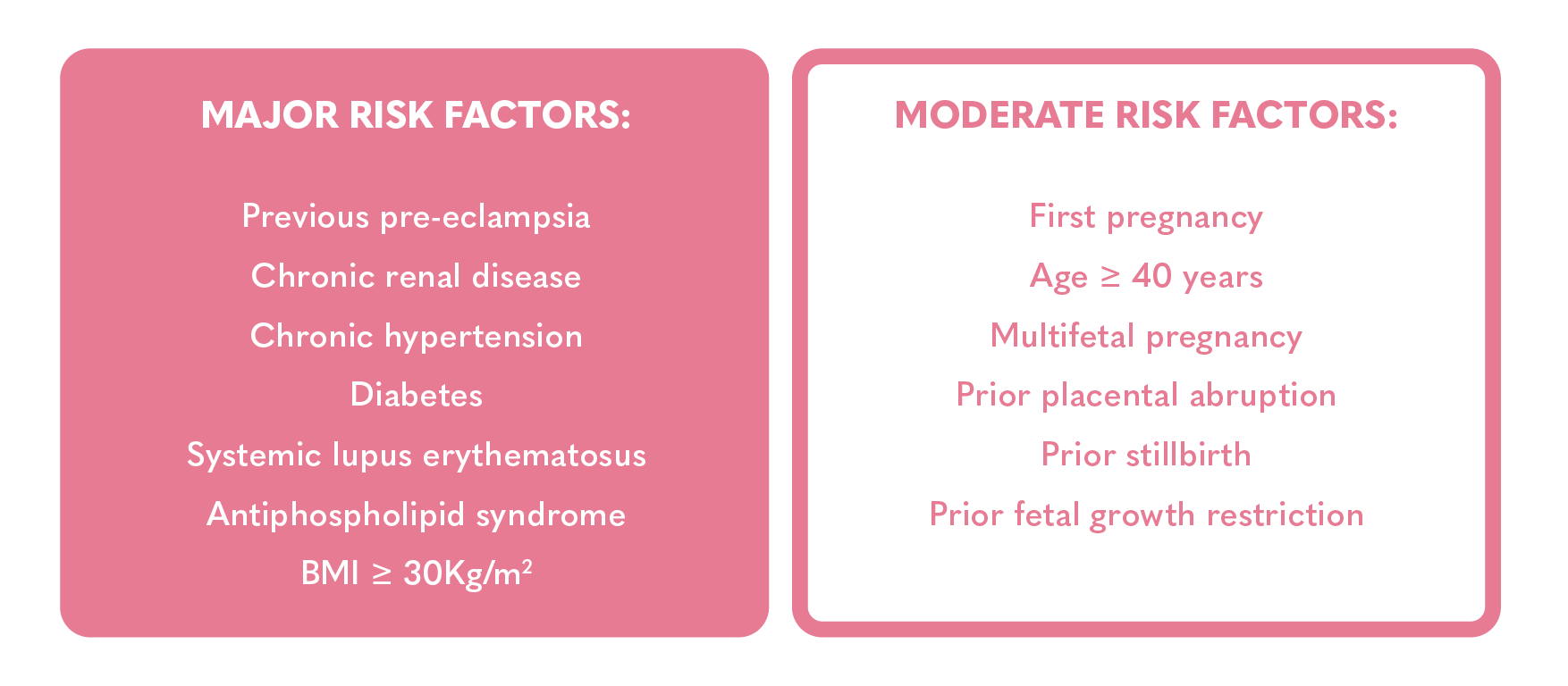 Pre-eclampsia is traditionally defined as new onset hypertension and proteinuria in pregnancy1, however, the International Federation of Gynaecology and Obstetrics’ (FIGO) clinical definition describes it as sudden onset hypertension (>20 weeks of gestation) and at least one of the following: proteinuria, maternal organ dysfunction or uteroplacental dysfunction2. It is responsible for an estimated 70’000 maternal deaths, and 500’000 foetal deaths globally3. Pre-eclampsia affects around 4% of pregnancies in the US and is more common in low-to-middle income countries (LMICs), displaying an overall pooled incidence of 13% in a cohort from sub-Saharan Africa4. The risk factors for pre-eclampsia are shown in the graphic below.