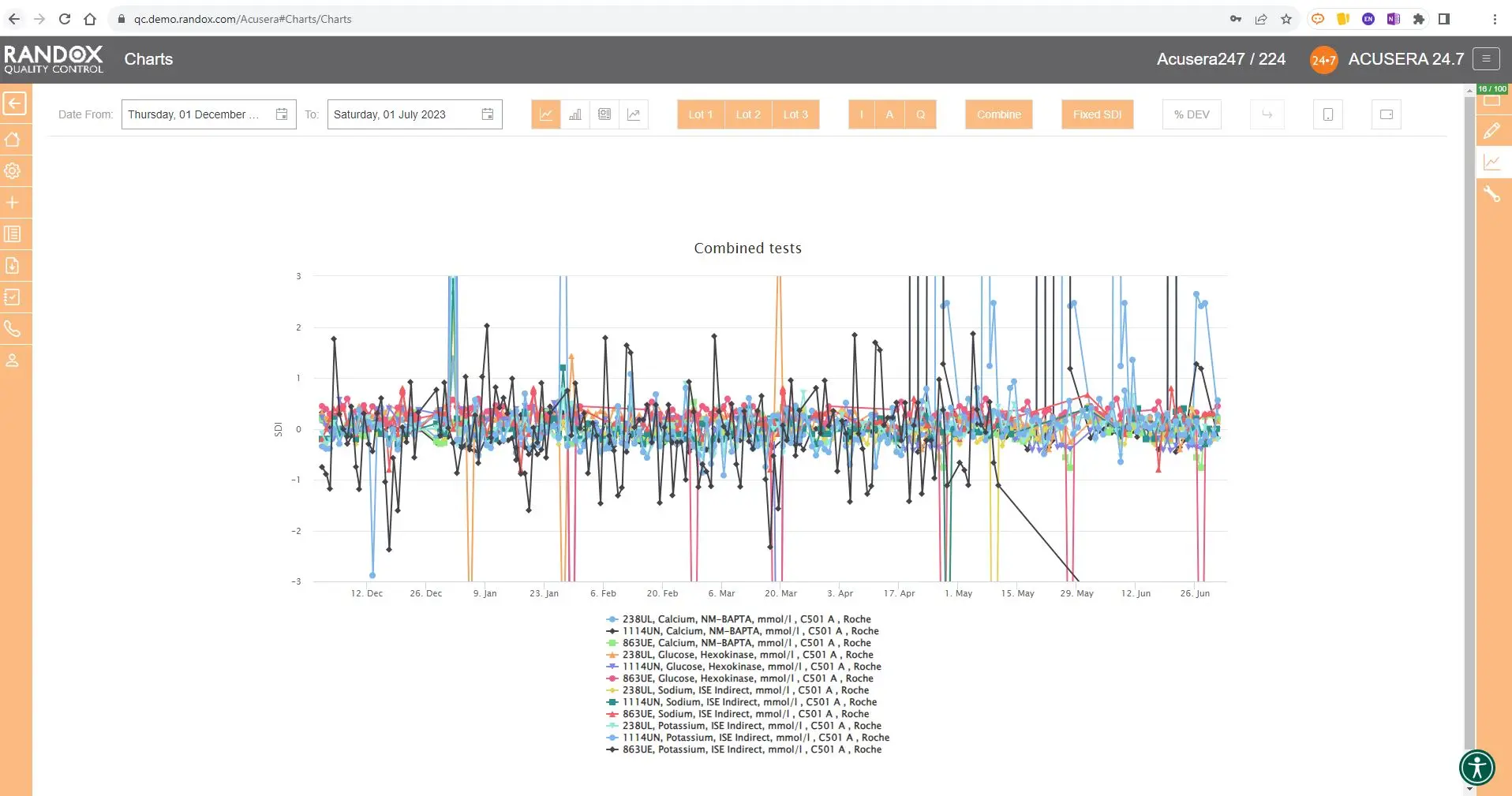 With Acusera 24.7’s interactive Levey-Jennings charts, you can see the QC data from a specified date range. This helps visualise trends and biases over any period to simplify the troubleshooting and lot validation processes, or, can be used as evidence during accreditation assessments. These charts can be generated for a single analyte or for multiple analytes and QC levels.