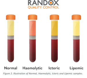 As part of our Acusera quality control range, Randox has developed the Serum Indices quality control to aid in the detection of the common pre-analytical error’s haemolysis, icterus and lipemia, collectively known as HIL. HIL interference can have disastrous effects on the quantification of many analytes, and it is therefore vital to determine levels of interference to improve laboratory efficiency and reduce the frequency of erroneous results. Figure 1 shows a graph of wavelengths at which each of these interferents may affect assays and the table below describes these forms of interference:
