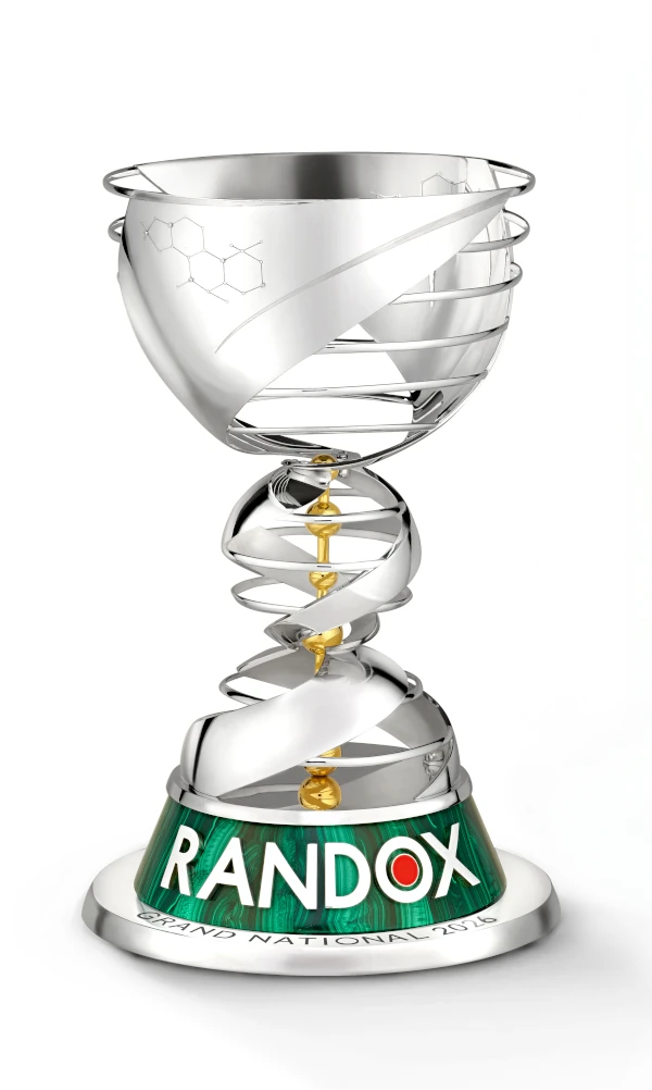 The trophy is inspired by the twisting double helix structure of DNA – the fundamental blueprint of life, winding together and opening up to form the cup’s striking shape. Its elegant form reflects Randox’s commitment to advancing healthcare through cutting-edge research and innovative testing solutions that improve health outcomes worldwide. At the heart of the design, a molecular network forms the core of the trophy, symbolising the complex biological systems Randox works to protect. Engraved on the surface is a steroid nucleus representing Randox’s expertise in diagnostics and preventative health testing. Flowing beside the nucleus, a fine line sweeps across the surface of the cup, a nod to the Randox Grand National finish line, a representation of a pioneering attitude determination and skill, all of which Randox value in their own research.
